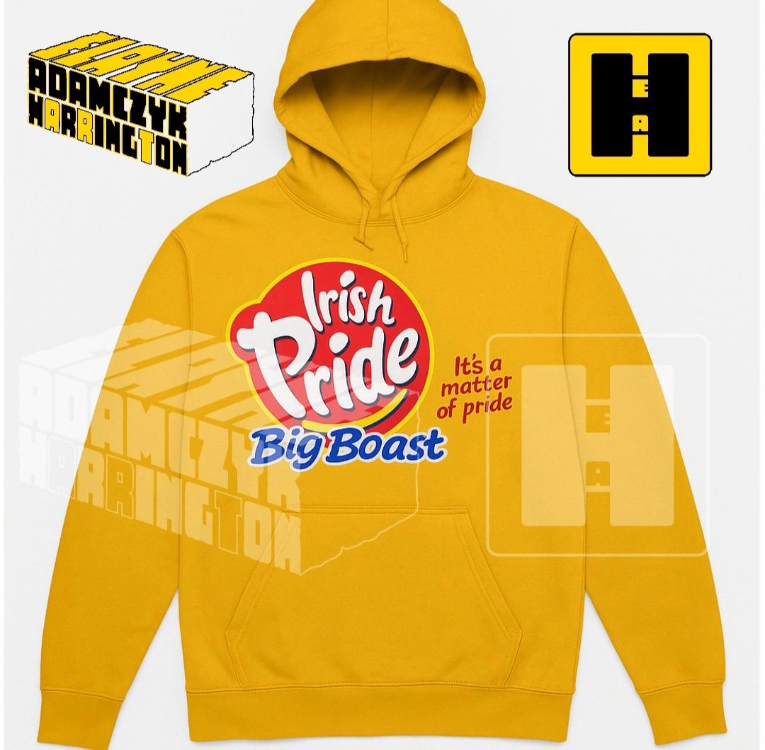 Description: This wearable artwork reimagines the familiar Irish Pride bread logo into Big Boast—a rebranded emblem of cultural commentary. Screenprinted onto a yellow hoodie, the work operates as both a garment and conceptual vessel. It fuses fashion, nostalgia, and critique, echoing the swagger of hip hop’s golden era while examining the commodification of Irishness. Like Hot Butter On Our Breakfast Toast borrows its title from The Sugarhill Gang’s Rapper’s Delight, foregrounding a transatlantic dialogue between hip hop lyricism and Irish working-class identity. The yellow hoodie is not just an aesthetic choice, but a chromatic link to the artist’s ongoing musical canon and an emblem of youth, resistance, and performative identity. In reclaiming this garment—once stigmatised in public discourse—the piece aligns street culture with national branding, drawing a line between the hood and the harp, the borough and the bread bin. Positioned between the gallery and the ghetto, the piece interrogates appropriation, pride, and poetic self-expression, while asking: What does it mean to wear your culture—not as costume, but as critique?